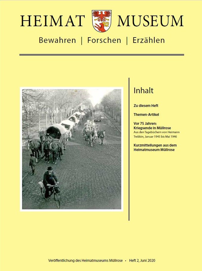 Das zweite Heft der Schriftenreihe beschäftigt sich mit dem Ende des Zweiten Weltkrieges in Müllrose vor 75 Jahren. Frau Dr. Doris Obschernitzki nahm sich diesen zeitgeschichtlichen Ereignissen an und wertete hierzu die Tagebücher von Hermann Trebbin aus, die sich im Bestand des Müllroser Heimatmuseums befinden. Hermann Trebbin, langjähriger Rektor der Müllroser Stadtschule, Heimatforscher, Begründer des Heimatmuseums und der Stadtbücherei, hielt von 1941 bis 1947 in herkömmlichen Schulheften Gedanken zum Alltagsleben in Müllrose fest. Frau Dr. Obschernitzki wählte aus diesen Heften Zitate des Zeitraums Januar 1945 bis Mai 1946 aus und kommentierte sie. Das Heft schließt mit Kurzmitteilungen aus dem Museum: die Digitalisierung der vergangenen Osterausstellung sowie der geplanten virtuellen Ausstellung „Das Fotoatelier Ursula Raschke in Müllrose, 1963 – 1984“.