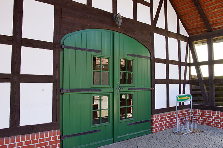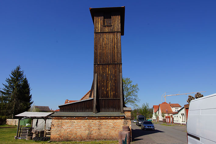 Unweit vom Haus des Gastes, am Beginn des Naturerlebnis- und Lehrpfads gelegen, befindet sich eine weitere stadthistorisch-architektonische Sehenswürdigkeit – das Feuerwehrgerätehaus mit hölzernem Schlauchturm. 1925 erbaut, diente das Gerätehaus in der Schiffbauer Straße, nur wenige Meter von der Kanalbrücke entfernt, der Unterbringung der technischen Feuerwehrausrüstung. Im hölzernen Turm wurden die Schläuche zur Trocknung aufgehängt, daher auch die Bezeichnung Schlauch- bzw. Trockenturm. Mit dem Ausbau der Technik und der steigenden qualitativen Anforderungen erwies sich das Gebäude bald als zu klein. Seine Nutzung endete im Jahr 1964, als die ehemaligen Garagen der Mühle in der Alten Poststraße als Feuerwehrgerätehaus eingeweiht werden konnten.